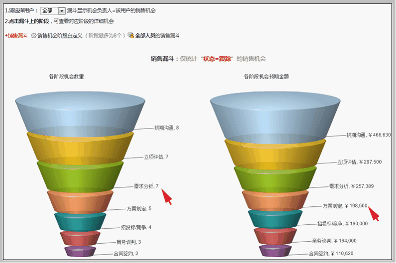 要注意的是:XToolsCRM的销售漏斗只统计状态=跟踪