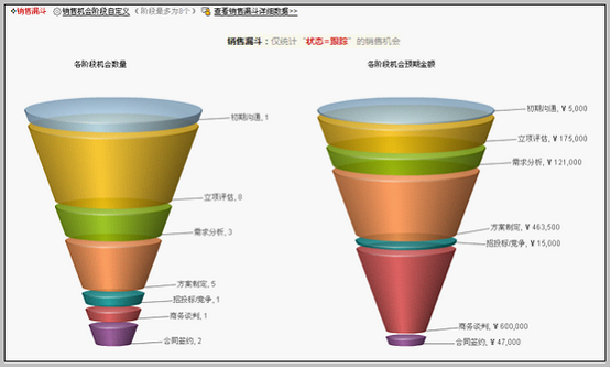 销售漏斗的查看 从菜单进入销售机会列表,可看到销售漏斗如下图所示: