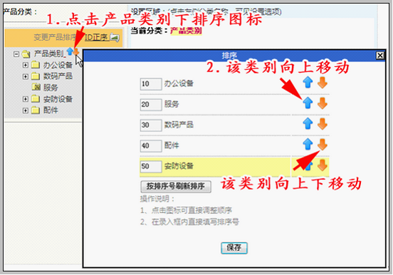 使用上、下箭头排序,比较适用于产品分类相邻或需调整分类较少情况,操作简单方便。
