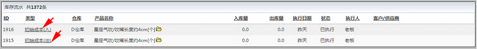 当产品启用先进先出之后,每个仓库的库存流水中都会增加类型为初始成本(入)和初始成本(出)的库存流水记录。这两种类型的库存流水是系统自动生成的,没对应单据,不可操作。如下图: