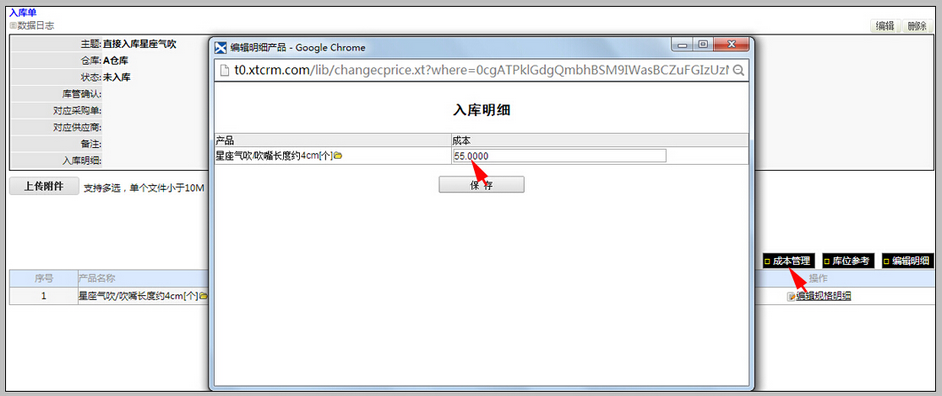 拥有产品成本价格权限的库管人员,直接入库,在入库单视图中可看到成本管理按钮,可编辑产品的入库成本,默认为产品表的自动成本。如下图:
