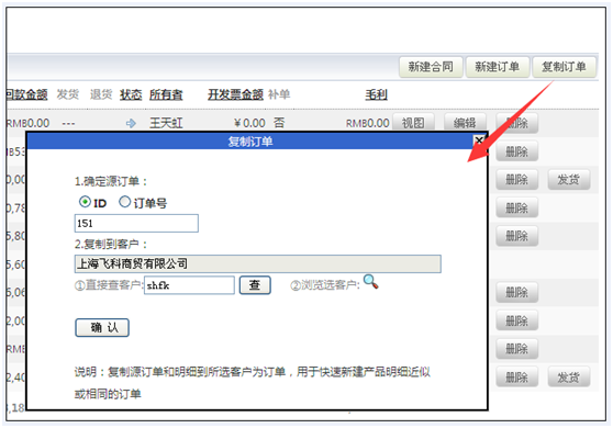 复制订单 将源订单和明细复制到所选客户里,直接生成新订单,ID号会顺序排列生成。用于快速新建产品明细近似或相同的订单 用途: 1)当某个客户有重复某购买时。 2)有组合销售时。 综合:订单复制功能,是为了解决重复购买相同或相似明细时,减少录入时间而设计的 操作页面和显示效果:支持在订单列表和客户视图中复制订单,并可以按照订单ID号或者是订单号查找源订单 如下图所示: 1.点击“复制订单”按钮,选择ID方式,输入要复制的订单的ID号码 2.选择将要复制到哪个客户。 3.点击“确认”按钮。