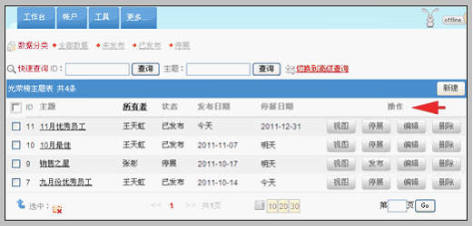 :进入所选光荣榜主题列表界面,可以进行停展和编辑。
