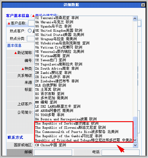 在新建企业(个人客户中客户基本信息,“国家或地区"新增了塞尔维亚 Serbia、斯洛文尼亚Slovenia 欧洲、波多黎各Puerto Rico 北美洲、冈比亚 Gambia 非洲等国家信息,如下图: