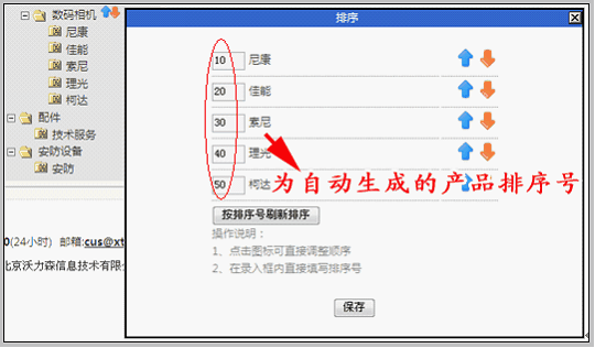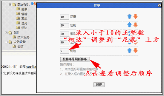 排序方式说明: 1.产品分类排序,根据“排序号”从小到大顺序排列。 2.以“柯达”为例,我们若想将“柯达”调整到“尼康”上方,需在“柯达”中录入正整数值小于“尼康”排序号10即可。即我们在“柯达”中录入1—9正整数,都可将“柯达”调整到“尼康”上方。 3.同样的道理,若在某类别录入的“排序号”为10—20之间的正整数,即可将该类别调整到“尼康”下方,“佳能”上方。 点击“按排序号刷新排序”即可查看调整后产品分类显示位置,确认无误保存即可。