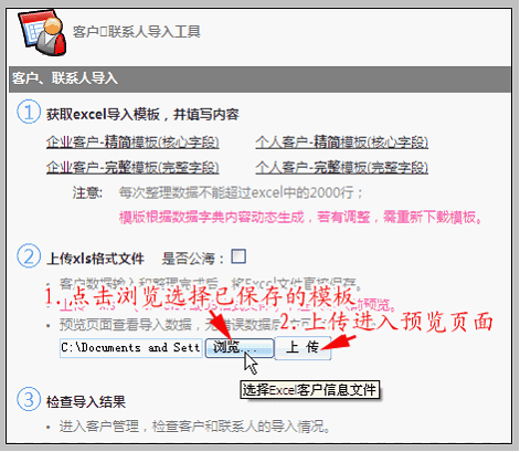 我们将保存后的文件“customer_simple.xls”上传,进入客户前的数据预览页面。“客户”菜单->“客户导入”中上传导入文件 如下图: