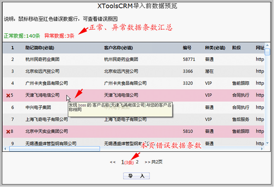 说明: 1、预览页面对导入数据进行校验 2、汇总正常数据、错误数据条数 3、红色行错误数据,鼠标移动上去可查看原因 4、预览页面序号与Excel显示一致,方便数据核对 5、点击“导入”开始上传客户。可忽略错误数据,只将正确数据上传 注意:错误数据需到Excel模板中修改。可根据预览页面显示的错误行序号以及错误提示修改,将数据修改正确后,再重新上传Excel模板。 |