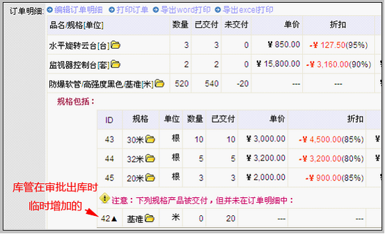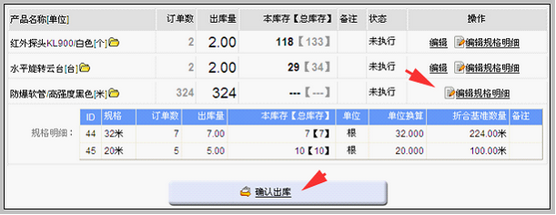 多规格产品出库:当订单出库时 销售人员做好订单后,如果订单中包含多规格产品,则订单明细中有明确的显示,举例如下: 这个订单中含有两种普通产品:水平旋转云台和红外探头KL900,以及一种多规格产品防爆软管的两种明细:32米规格和20米规格。此订单生成的出库单由库管审批,界面如下: 可以直接确认出库,也可以调整规格后确认出库。 遇到库存不够,需要多次发货时,即需要调整规格。方法是,点击上图中的编辑规格明细。看到如下图的界面: 可以在这里编辑或变更各种规格的数量,比如我们把32米规格的出库数7改为6等,总之根据本次实际出库量调整规格数字即可。通过这种方式可以实现多次出库。 库管在订单审批中临时增加产品出库 有很少的企业允许库管临时性增加出库产品,这种情况也可以实现。不过临时增加的规格产品会在订单中显示出来,并有明显提示,如下图所示: