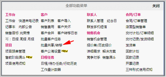 批量客户处理:批量共享、批量转移 快捷菜单位置:更多->客户:批量客户共享和转移,如下图: