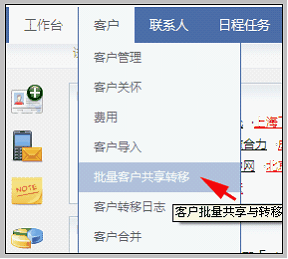 高级菜单位置:客户->批量客户共享和转移,如下图: