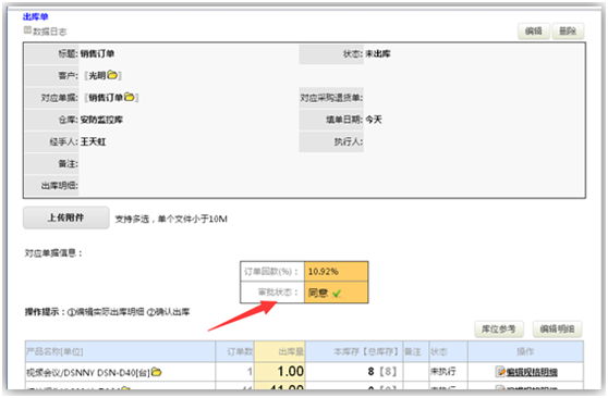 库管在进入出库单时,可看到对应订单回款百分比和审批状态(如果启用审批),库管人员可据此判断是否马上操作确认出库。如下图所示: