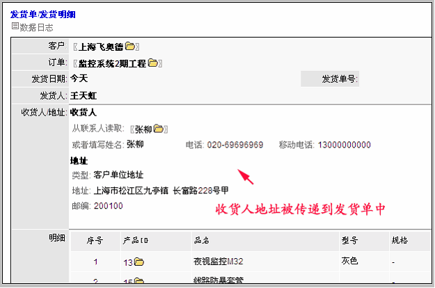 注意,这里内容务必填写正确,这些内容将在销售人员点击订单发货时传递给库管。库管人员依据此数据发货。 库管在出库后,进入发货单 可在发货单中看到订单传递过来的收货人地址等信息,如下图:
