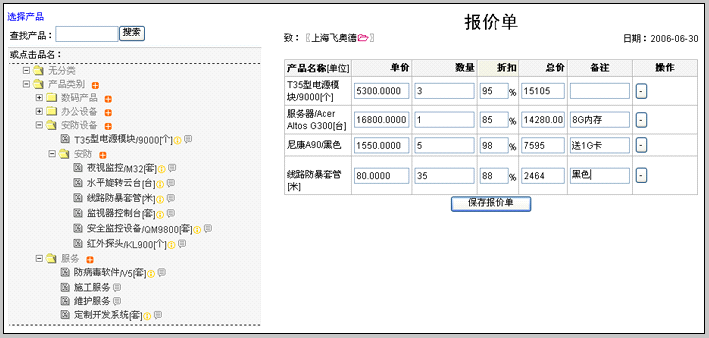 可在选择产品后,自动调用单价,根据数量和折扣,自动计算总价