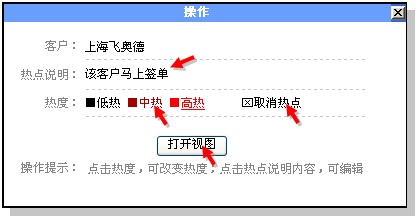 注意:热度根据高中低分三种颜色,如果变更热点客户的热度,在工作台上显示的热点客户颜色也随之变化。比如,热度为高热的客户,在工作台热点客户模块内是红色的。