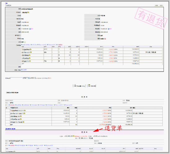 注意填写清楚应退款金额和退货后产品入库的仓库。其中:应退款金额在实际应用中应该是和客户事先沟通好的。填写后保存。保存后,即可在订单视图内,看到红色退货单。如下图所示: