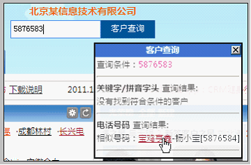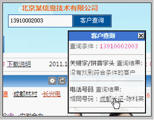 菜单中客户查询支持用电话查客户 操作 在菜单条上的客户查询中,支持输入电话号码查找客户的功能。 即可以实现号码的精确匹配查找(如上图),也可实现模糊匹配查找(如下图): 模糊查询出的相似号码,规则时:只有末尾两位不同。