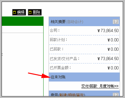 说明: 往来对账的作用是把客户的回款,和给该客户的发货流水按月的方式,提供一个汇总。 对于一些按月结算的销售模式,可以直接看出结算额。 对于普通方式销售的用户,也可以通过往来对账,查看发货和回款的差异。 操作方法: 1.在客户视图的右侧,看到如下图所示模块: 2.点击“交付/回款 月度对帐>>” 看到往来的对帐表,如下图: