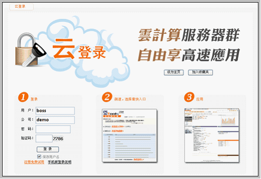 进入云登录页,可以看到三步提示。1.登录2.测速选入口 3.应用。如下图所示: