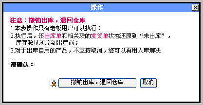 撤销出库的功能 说明: 只有Boss用户可以撤销出库操作。 撤销出库单的操作: 1.用Boss用户登录,进入 出库单管理 列表中的出库单后面,有撤销按钮