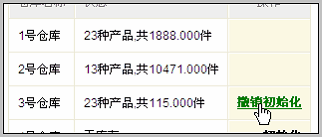 点击确认后,盘点操作撤销。对于撤销后的盘点数据,允许被删除。 库间调拨的撤销操作 在库间调拨列表中,有仓库管理权限和撤销权限的用户,能看到撤销按钮。点击后确认,即可撤销库间调拨操作。 具体操作同上。 仓库初始化的撤销操作 当仓库初始化之后,还没有进行相应的出入库、盘点和调拨操作之前,是允许撤销初始化的。 拥有仓库管理权限和撤销权限的用户,能够在该仓库后面看到撤销初始化。 注意:已经进行过出入库等操作的仓库不允许撤销初始化操作,除非您把该仓库的全部出入库、盘点和调拨都撤销删除之后,方可看到撤销初始化操作。
