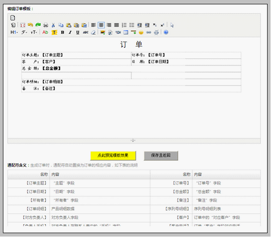 报价单、订单、发货单打印模版自定义 说明 报价单、订单和发货单的打印模版支持自定义功能,可为企业实现更个性化的打印样式。 操作 帐户菜单->系统设置->单据打印模版 编辑界面 注意,使用通配符可在生成后自动变换为数据。通配符使用时需带上两边的【】,比如【订单主题】等。 编辑模板时,可以在Word中先按照表格形式做好,并复制,然受使用编辑模板中的