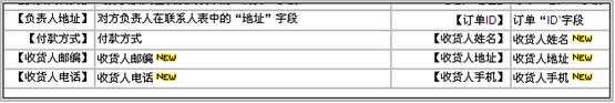 这些内容均可引入到订单打印模板中,对于:希望在打印订单时直接包含收货人信息的企业来说,这些内容是非常方便的。 对应的数据 这些内容对应的数据,是在订单中的收货人/地址部分内容,如下图所示: