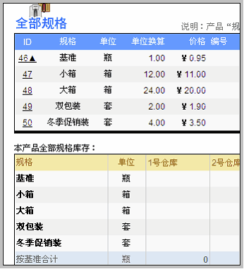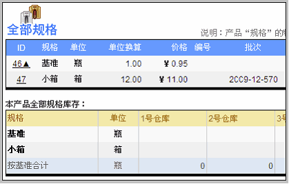 在产品视图内管理多规格产品 前面我们讲到,在产品视图界面、编辑订单明细界面、编辑采购明细界面以及编辑出入库明细界面时,均可新建其他规格产品。首先我们来看在产品视图内如何操作。 当我们在产品列表内新建产品,或者导入产品时,产品的规格字段是不可以编辑的,自动为“-”。只有当为该产品新建了其它规格产品后,该产品的规格字段变为“基准”。举例说明: 比如我们在产品中,新建了“哇哈哈矿泉水”,保存后在产品列表中如下所示 注意看图中,该产品的规格是“-”。 下面我们来为该产品建立多规格,包括:小箱12瓶,大箱24瓶两种。 进入产品视图