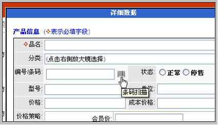 在产品管理中录入条码 新建产品或编辑产品时,单条录入方法 在新建产品时,看到编号/条码字段后面有一个小条码的图标,如下图:
