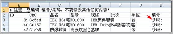 操作方法和导入客户联系人的方法类似。 不同的是:可以批量导入,也可以批量修改。这两种操作的模板不同。 注意:下载模板后,编辑编号/条码内容时,不要删除“条码:”字样,如下图: