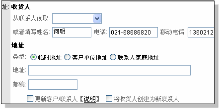 选择联系人后,收货人的电话、移动电话可自动读取出来。 如果在地址中也是选择的:联系人家庭地址,则会同时自动读取联系人的家庭地址作为收货地址。 直接新建收货人 如果收货人不在当前客户联系人中,需要新建收货人,直接在收货人姓名填写、并填写电话和移动电话。