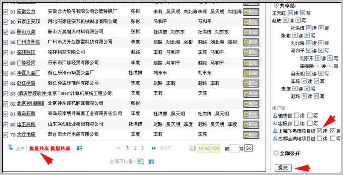 在批量客户共享/转移页面,我们设置成每页显示50条客户信息,全,点击批量共享钮,将客户共享给上海飞奥德项目组,点击提交钮。如图: