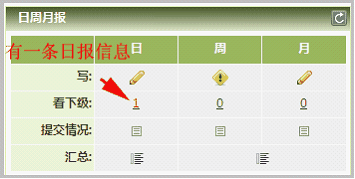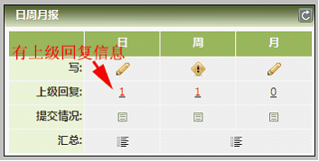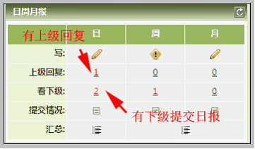 三个入口:“写日报”、“上级回复”,“看下级”,如图: 如果上级有新回复,在“上级回复”后面出现数字,如图中的: 如果下属有新日报或者回复,在“看下级”中也会出现数字提示,如图中的: